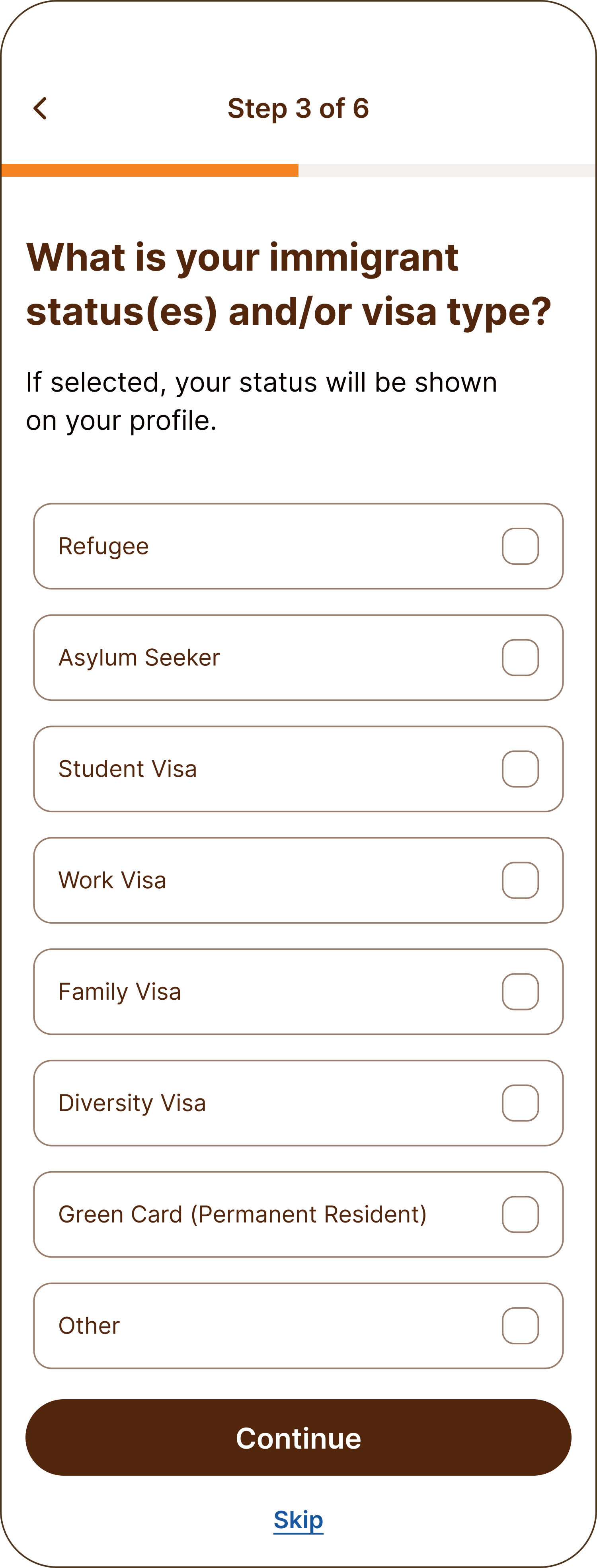Another design team member, Julia, created personas for immigrant users who are in the U.S. for different reasons. Each persona focused on the pain points we established and how they could achieve their goals and find resources. One of Juliaās personas is featured below.