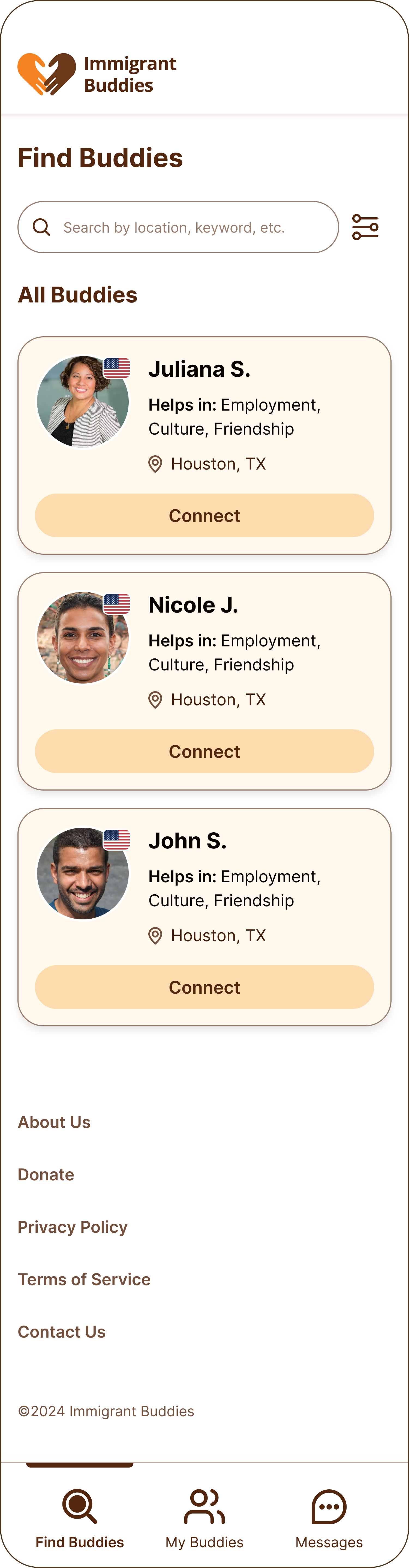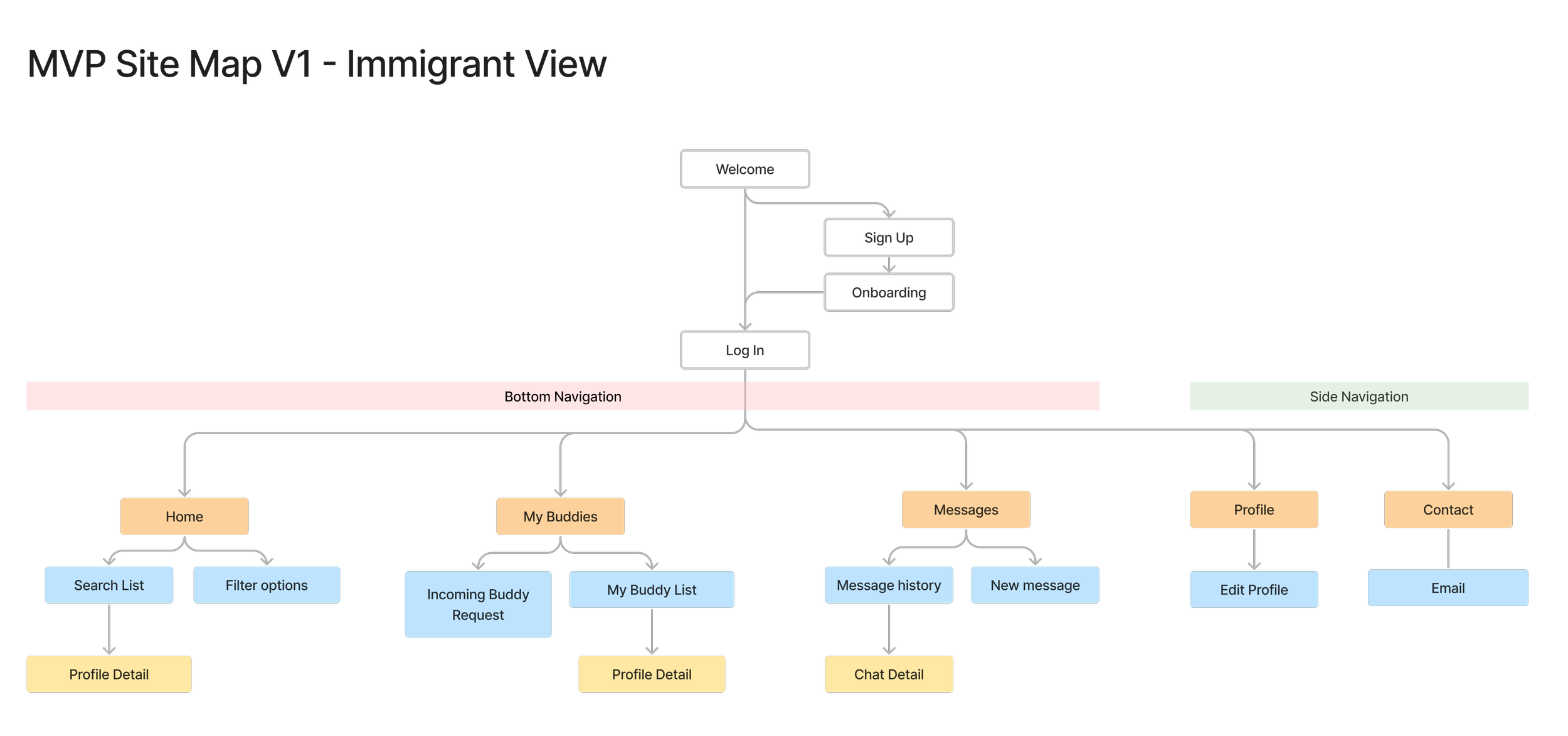User flows were created by my fellow designer, Alison. The flows for immigrants and buddies can be viewed here.