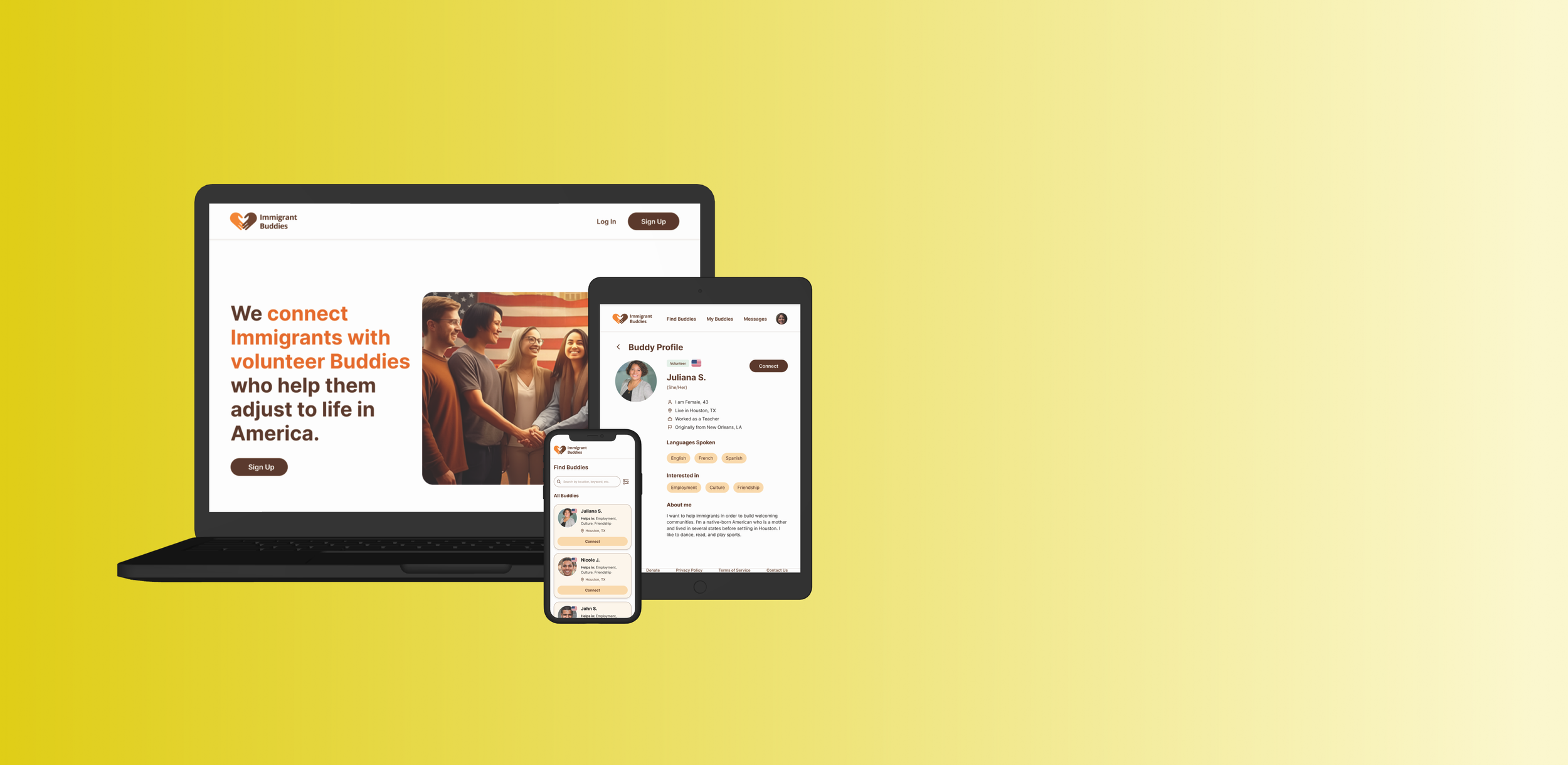 Immigrant buddies was created to help new U.S. immigrants adapt and incorporate more easily into American culture. Jennifer Jiang was the creator who helped run the design and research team of 5 others.