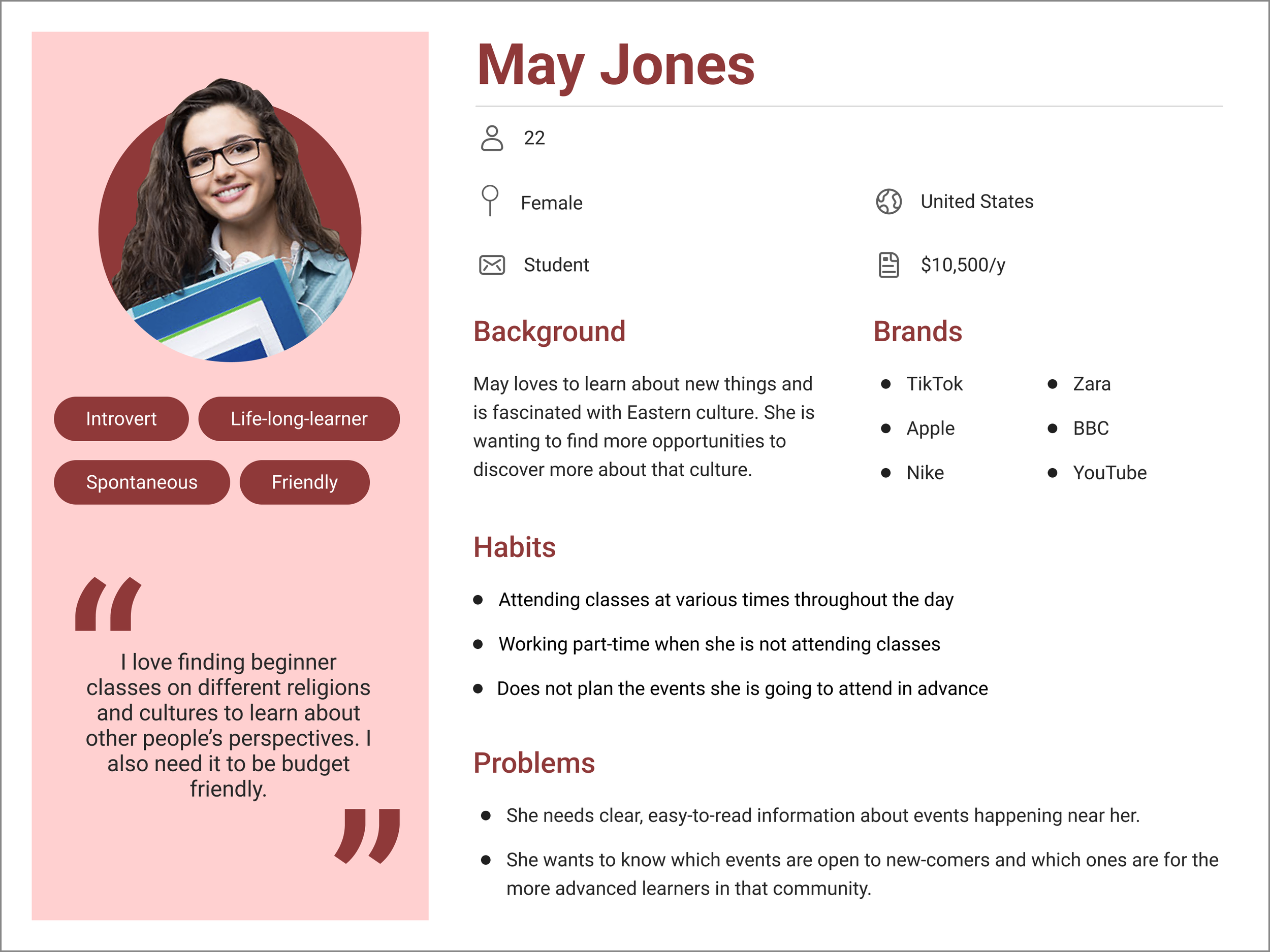 May is a student with an unpredictable schedule. She needs easy-to-read information so she can make a quick decision whether to attend an event or not.
